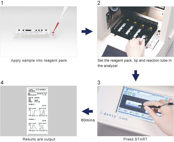 Until now UGT1A1 polymorphism measurement has mostly been performed using a manual method. The fully-automatic i-densy IS-5320 analyzer can be operated simply and by anyone.
